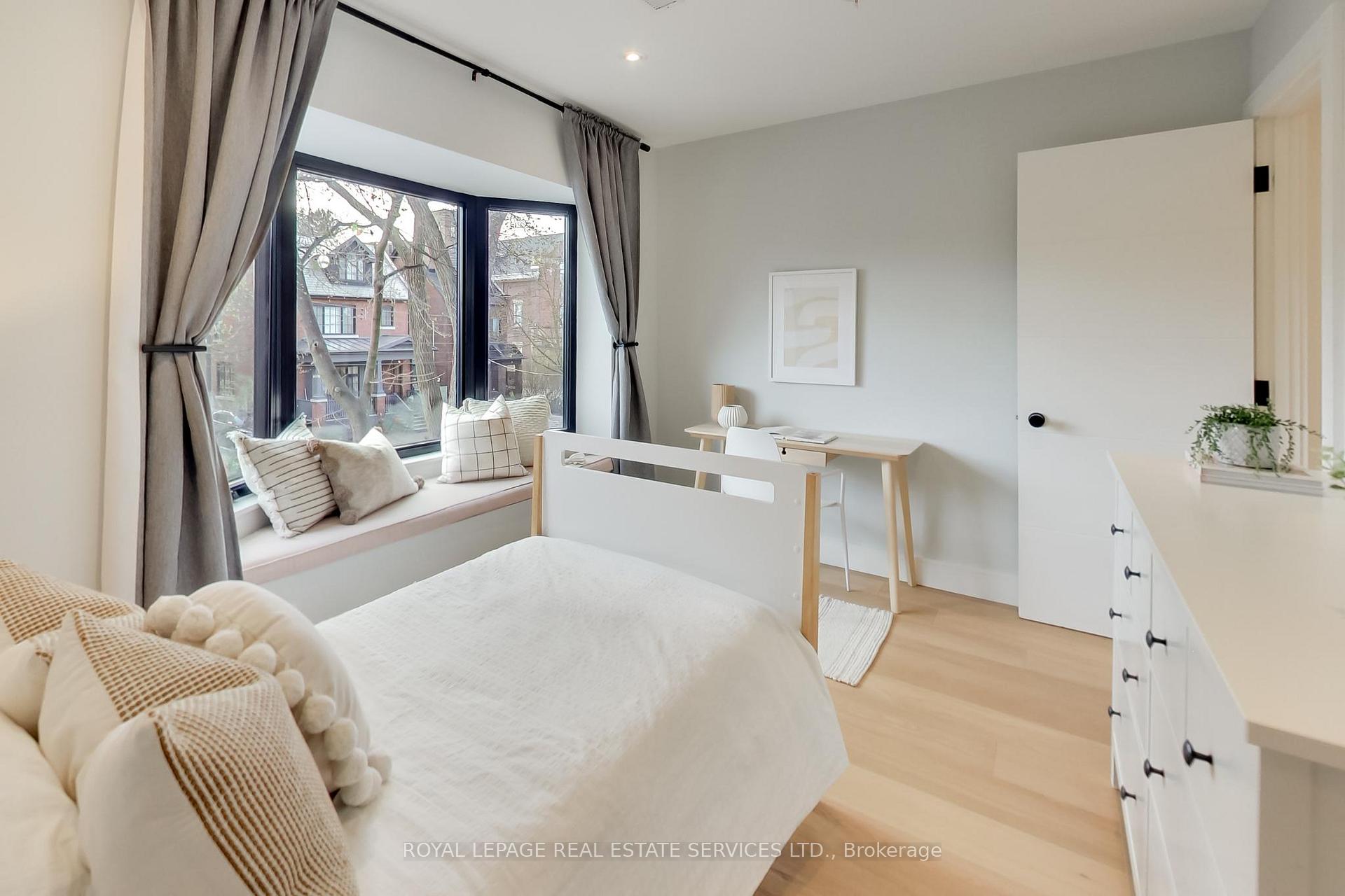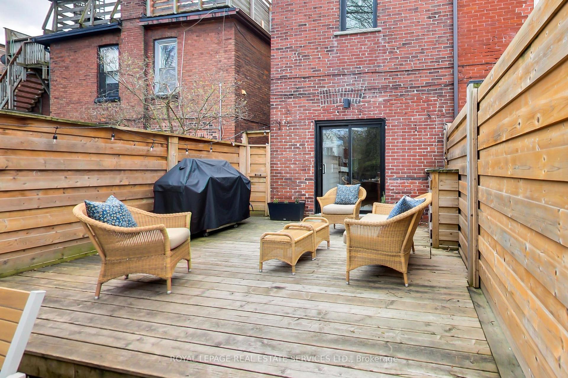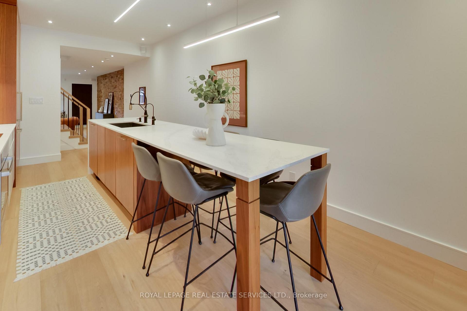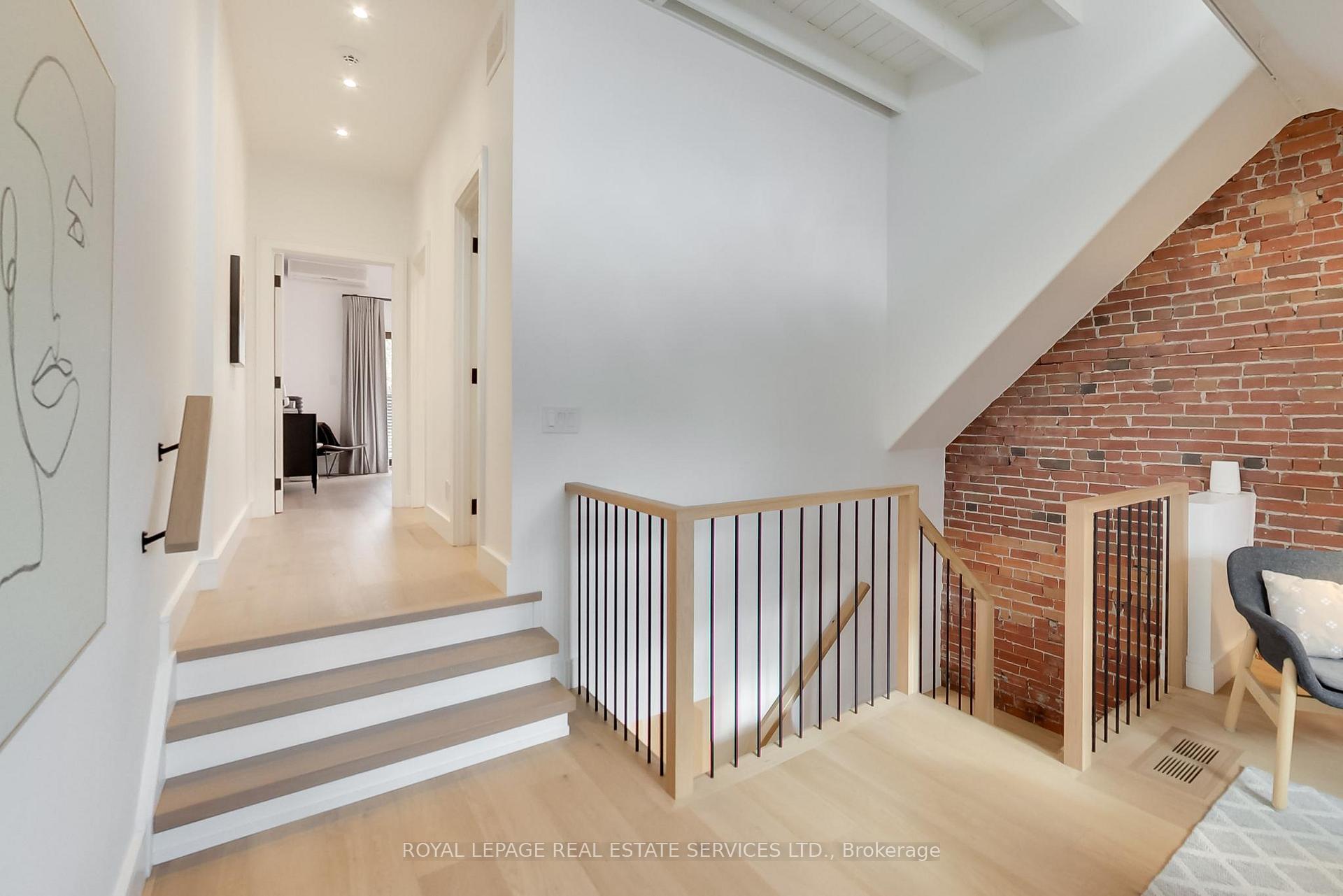 In the heart of the Annex, this exquisitely redesigned three-storey single-family home blends refined design with exceptional everyday livability. Gutted to the studs and thoughtfully reimagined by Palmerston Designs in 2019, it was crafted for elevated family living with warmth, function, and style. The main floor makes an unforgettable first impression with wide plank white oak floors throughout, soaring ceilings, exposed brick, and a rebuilt staircase with sleek modern railings. The heart of the home is a stunning chef's kitchen with a dramatic 12-foot island, integrated appliances, induction stove, drinks fridge, deep farmhouse sink, multiple floor-to-ceiling pantries, and added windows that fill the space with light. A powder room and coat closets complete this level. Sliding glass doors open to a tiered deck and an extraordinarily deep private garden beneath a mature tree canopy, creating a rare urban retreat for entertaining and quiet family moments alike. The upper floors offer an outstanding family layout. The second floor features two spacious bedrooms, each with a dedicated bathroom, a separate family room, plus a laundry room. The entire third floor is devoted to a luxurious primary retreat with exposed brick, vaulted ceilings with exposed architectural beams, abundant natural light, a walk-in closet, spa-inspired ensuite, private balcony, and a flexible lofted space ideal for a home office, lounge, nursery, or creative studio. The 2nd floor family room and 3rd floor loft space could be enclosed for additional bedrooms if so desired. The finished lower level, with tall ceilings and a separate entrance, is set up as a dream home gym and offers incredible versatility. A rare opportunity to own a truly design-forward family home on a deep lot in one of Toronto's most coveted neighbourhoods. Steps to Dupont Subway Station, Jean Sibelius Park, top rated public and private schools and the bustling retail of Bloor Street plus fine dining on the Dupont Strip.