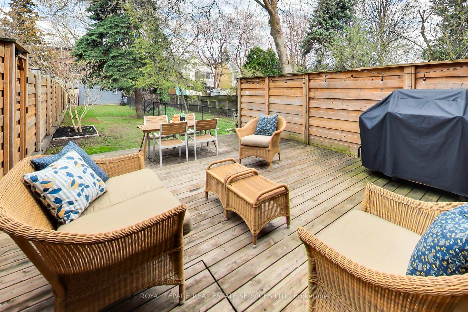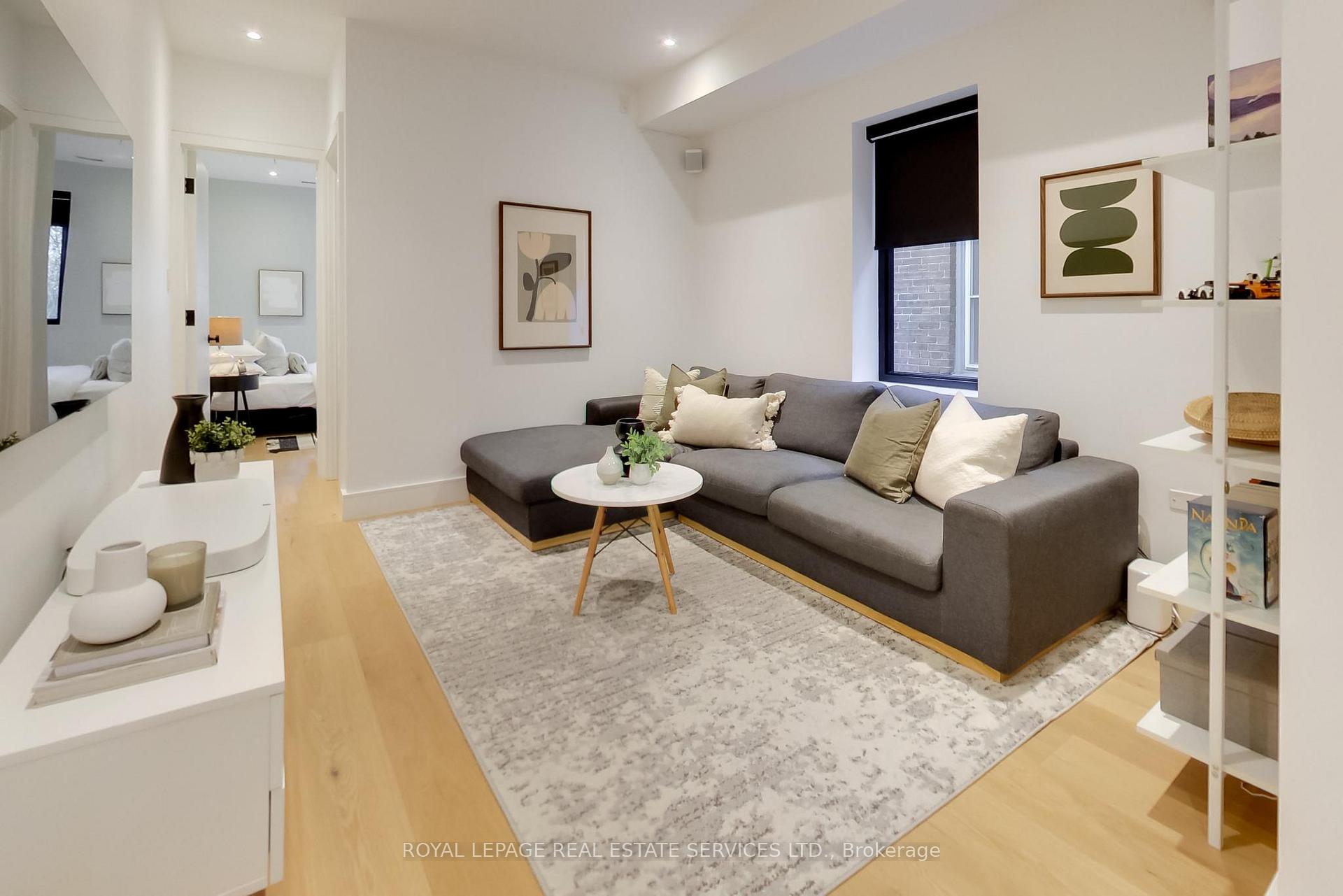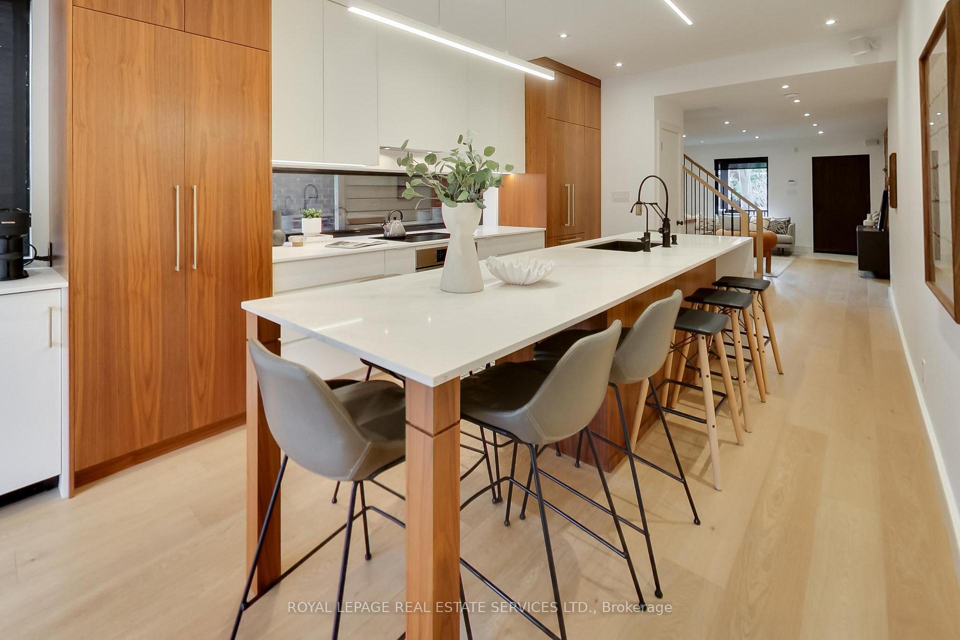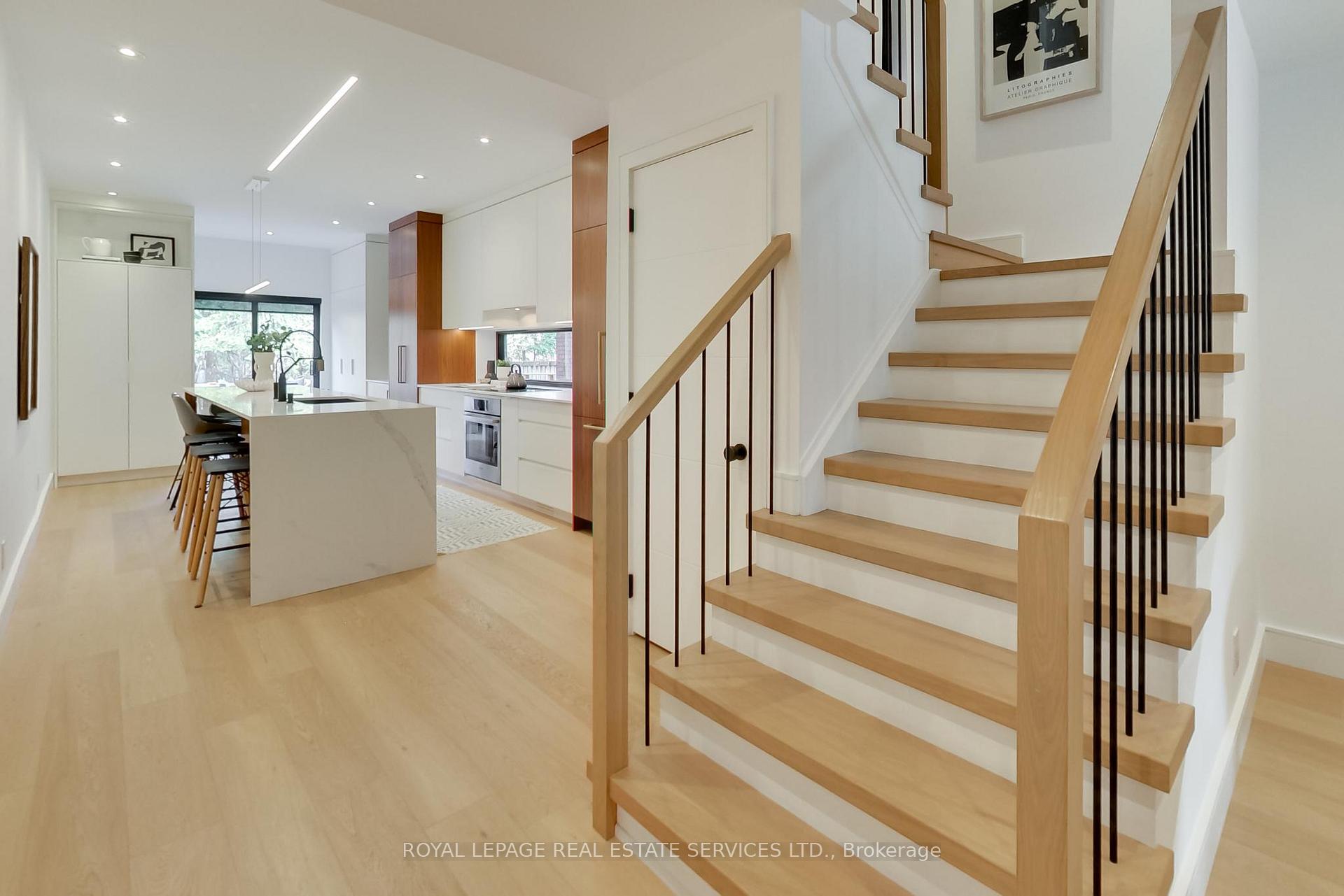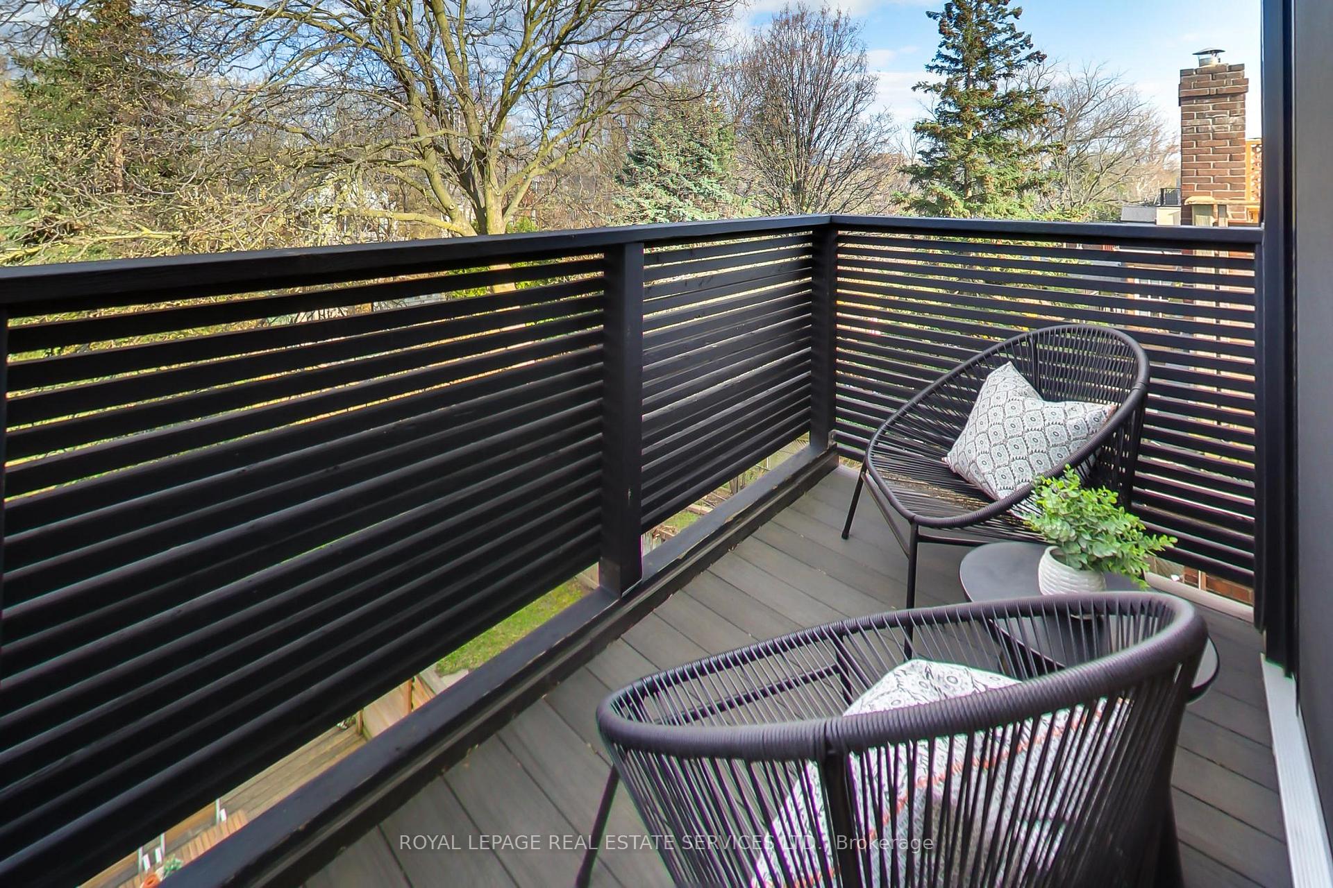 In the heart of the Annex, this exquisitely redesigned three-storey single-family home blends refined design with exceptional everyday livability. Gutted to the studs and thoughtfully reimagined by Palmerston Designs in 2019, it was crafted for elevated family living with warmth, function, and style. The main floor makes an unforgettable first impression with wide plank white oak floors throughout, soaring ceilings, exposed brick, and a rebuilt staircase with sleek modern railings. The heart of the home is a stunning chef's kitchen with a dramatic 12-foot island, integrated appliances, induction stove, drinks fridge, deep farmhouse sink, multiple floor-to-ceiling pantries, and added windows that fill the space with light. A powder room and coat closets complete this level. Sliding glass doors open to a tiered deck and an extraordinarily deep private garden beneath a mature tree canopy, creating a rare urban retreat for entertaining and quiet family moments alike. The upper floors offer an outstanding family layout. The second floor features two spacious bedrooms, each with a dedicated bathroom, a separate family room, plus a laundry room. The entire third floor is devoted to a luxurious primary retreat with exposed brick, vaulted ceilings with exposed architectural beams, abundant natural light, a walk-in closet, spa-inspired ensuite, private balcony, and a flexible lofted space ideal for a home office, lounge, nursery, or creative studio. The 2nd floor family room and 3rd floor loft space could be enclosed for additional bedrooms if so desired. The finished lower level, with tall ceilings and a separate entrance, is set up as a dream home gym and offers incredible versatility. A rare opportunity to own a truly design-forward family home on a deep lot in one of Toronto's most coveted neighbourhoods. Steps to Dupont Subway Station, Jean Sibelius Park, top rated public and private schools and the bustling retail of Bloor Street plus fine dining on the Dupont Strip.